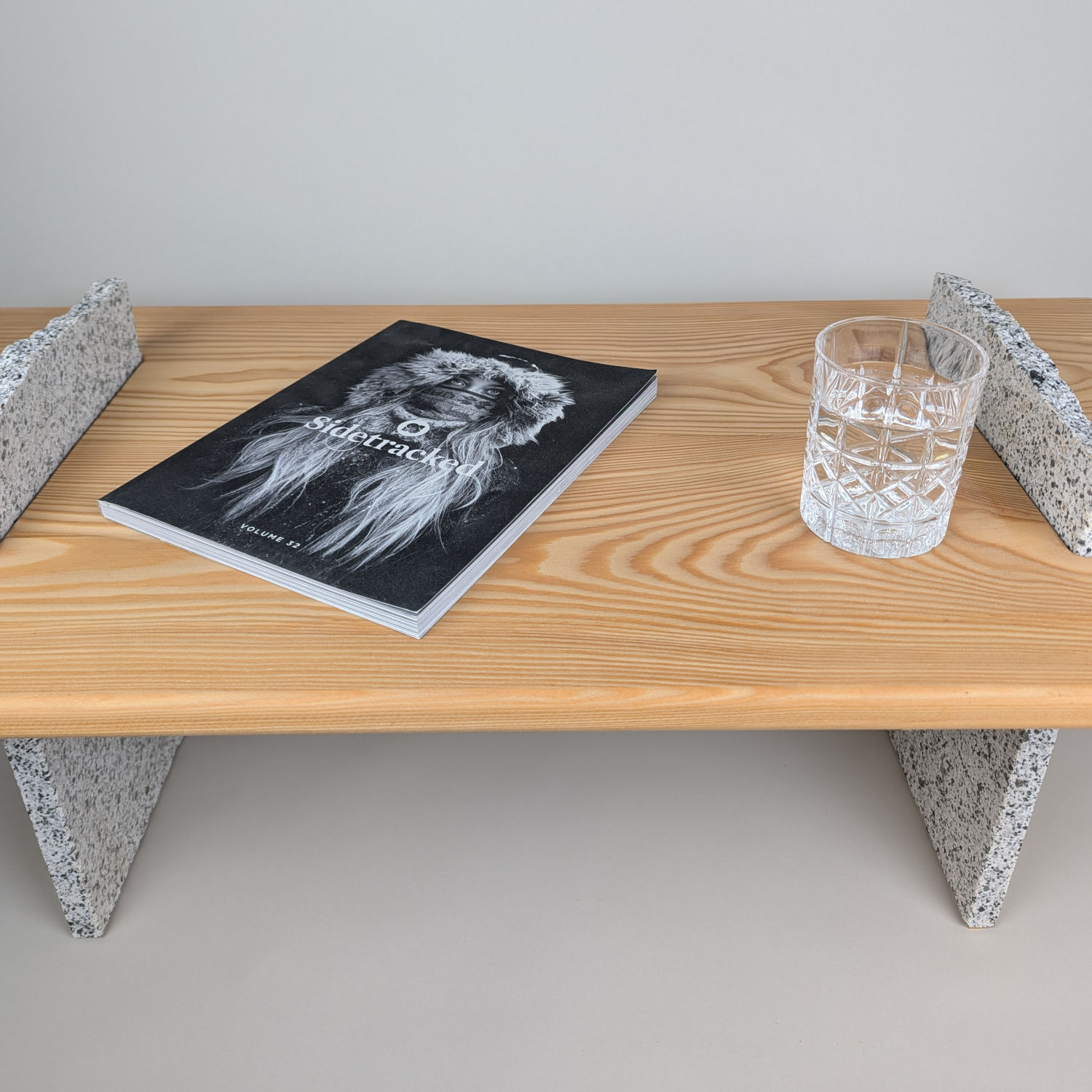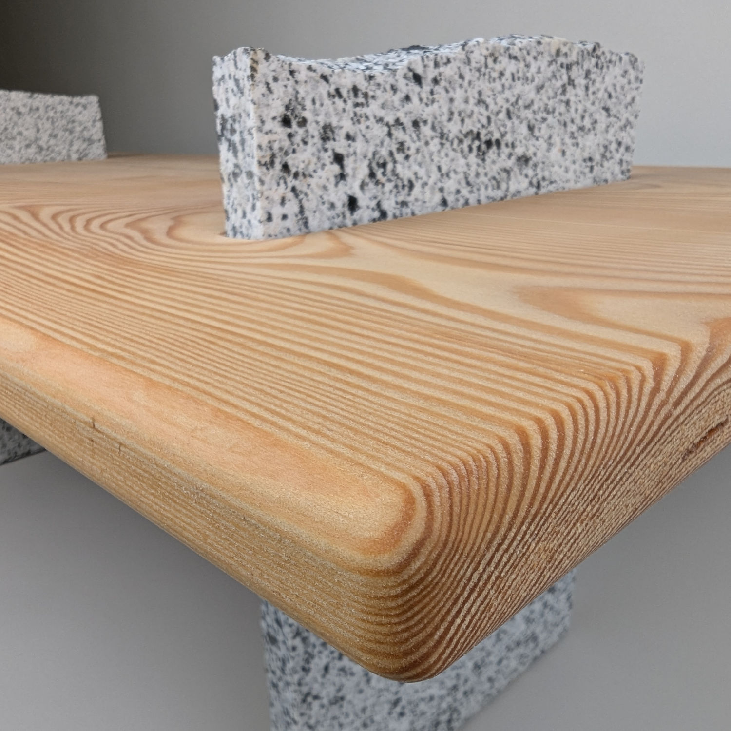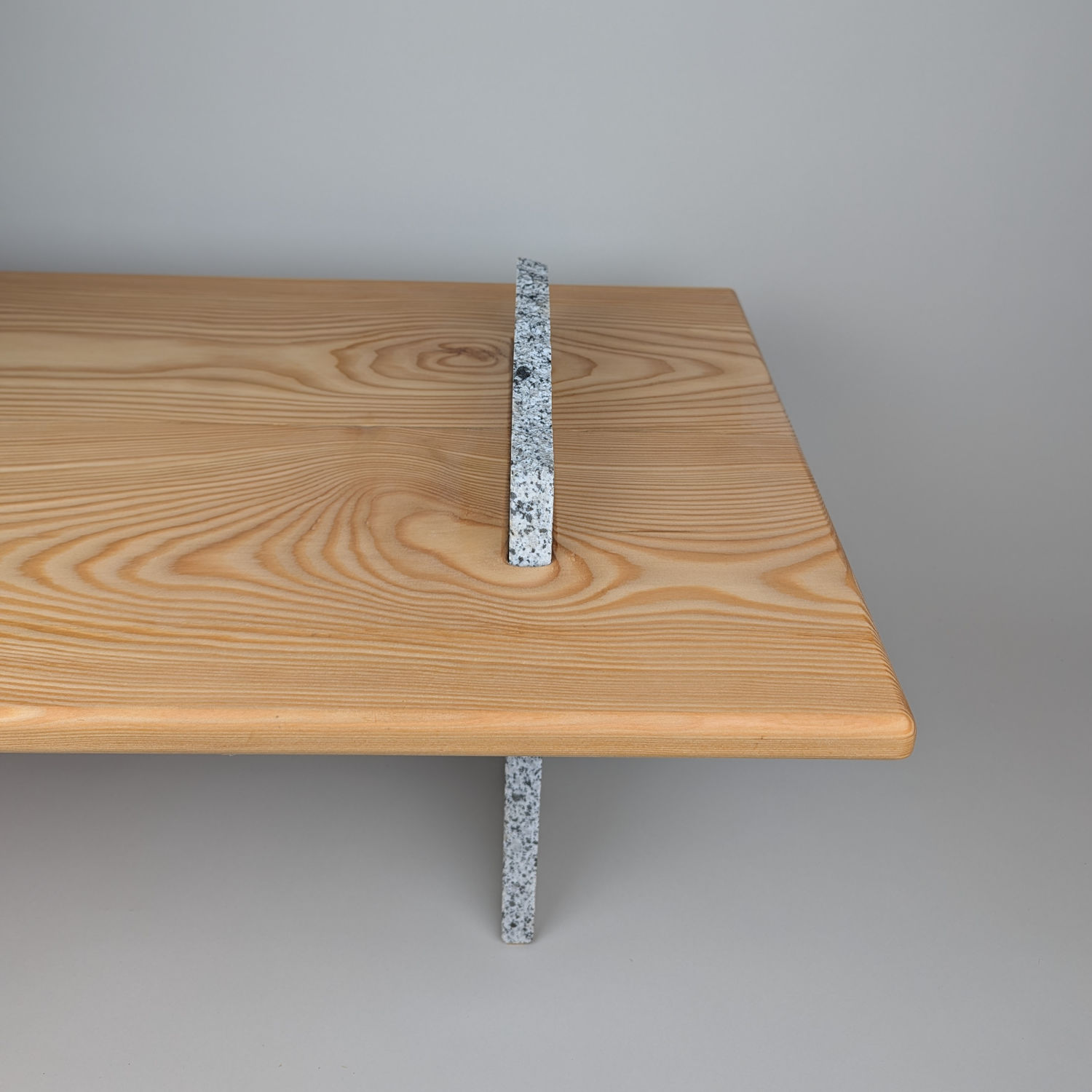 Stone Stage is a grounding centerpiece designed for open living spaces. The design is based on an interlocking structure: two Adamello granite plates act as the primary supports, cutting through the larch surface to extend above the horizontal plane. By letting the stone break the line of the wood, the table highlights the physical connection between the mountain stone and the high-altitude timber.